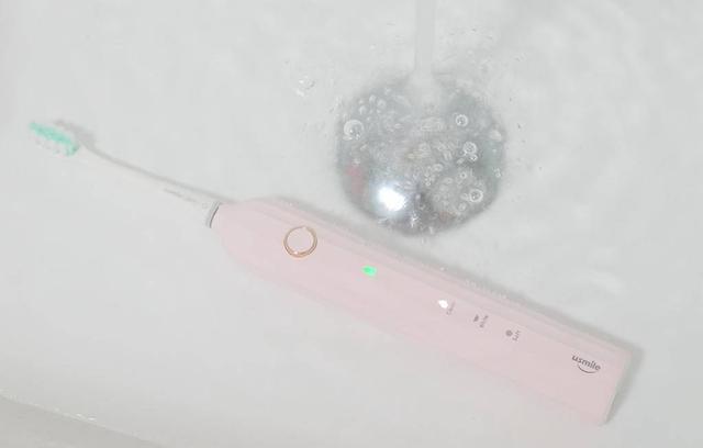 usmile Y1声波电动牙刷支持IPX7全身防水 ,所以直接扔进水里也没有任何问题当然,从图中就可以看出,牙刷还可以正常运行,当然牙刷一直在水里使用的情况不大可能发生,所以针对日常使用后进行全身清洗是完全没有问题的。