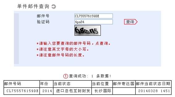 中国邮政邮件状态查询:打开中国邮政,输入上面得到的标准邮件号码,即:CL755576759DE