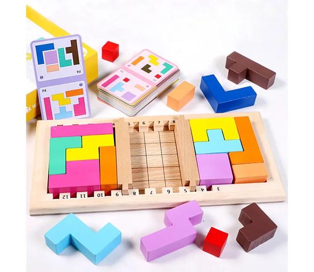 这套木质的拼图玩具,由五颜六色,形状各异的俄罗斯方块积木和游戏板构成。这些拼块可以单独拼搭,从平面到立体,从平面拼搭到创意拼搭,可以探索出不同的玩法。