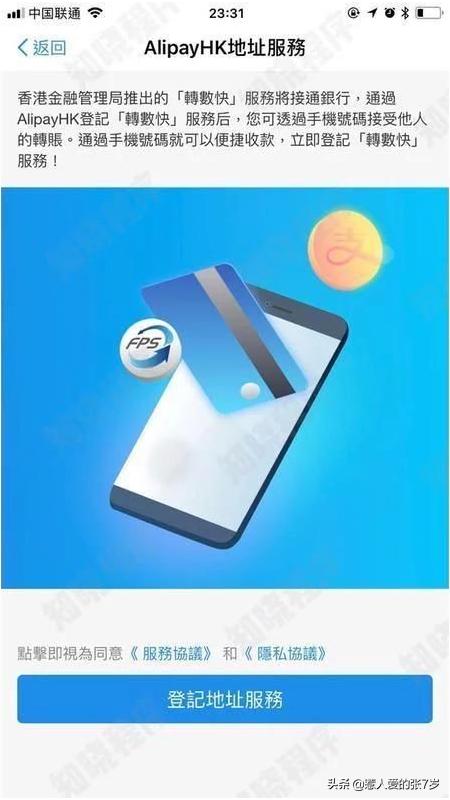 接下来,将进入 AlipayHK 地址服务,页面里简单介绍了「转数快」服务的作用:香港金融管理局推出的「转数快」服务将接通银行,通过 AlipayHK 登记「转数快」服务后,您可通过手机号码接受他人的转账、便捷收款。