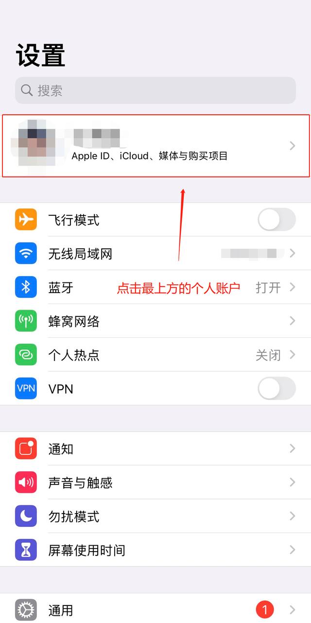 第一步:进入“设置”,点击最上方的个人账户