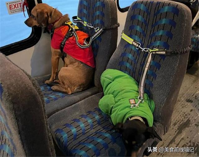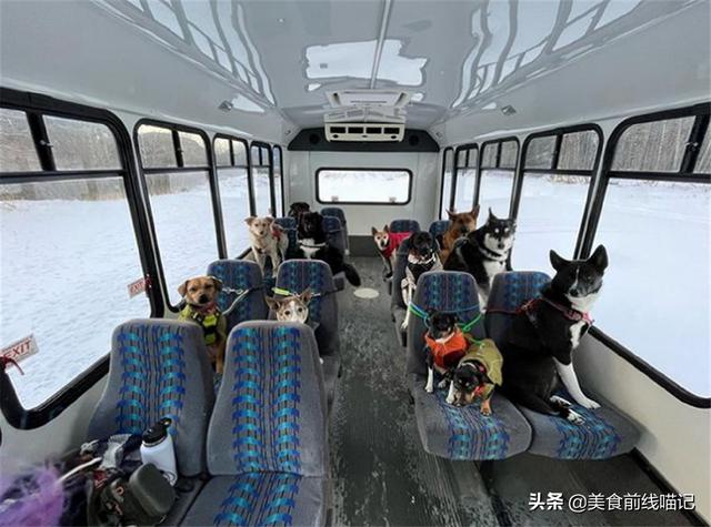 当学生们换成了汪星人,校车里的场面就变得格外逗趣!照片中每只狗狗都乖巧地坐在位子上,而在椅背上的牵绳就像是“安全带”一般。有些狗狗特别的兴奋,到处张望,而有些狗狗则有些紧张!这个场景和学生们去上学的情形也格外相似!