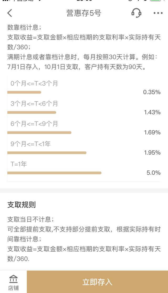 举例来说,营口银行的营惠存5号,满期利率为5%,若是中途取出,比如6个月就只有1.69%了。但是,若我们会发现阜新银行的6个月利率就有4.7%,这样的话,我就不会把钱都存入营口的一年期,我是又对短期进行了划分。