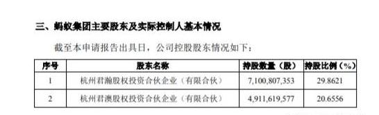 备案文件显示,蚂蚁持股5%以上的股东,分别为杭州君瀚股权投资合伙企业(持股29.86%)、杭州君澳股权投资合伙企业(持股20.66%)以及阿里巴巴集团(33%)。