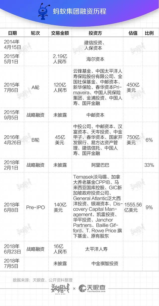 2015年、2016年蚂蚁分别完成A轮(约18.5亿美元)、B轮(约45亿美元)融资。2018年 6月 8日,蚂蚁金服宣布完成 140 亿美元的 C 轮融资,市场也给出了超过1500亿美元的估值。