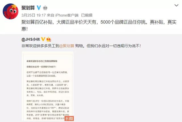 昨晚淘宝聚划算转发了一条微博,说:欢迎拼多多员工到聚划算购物,但我们永远对一切违规行为说不!