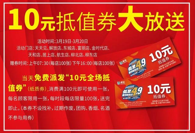 3月19日-20日,天天见店、解放店、东城店、富丽店、金时代店、天和店、居上店、航生店、柳北店、柳东店,每天上午7:30以及下午4:00各赠100张10元抵值券!