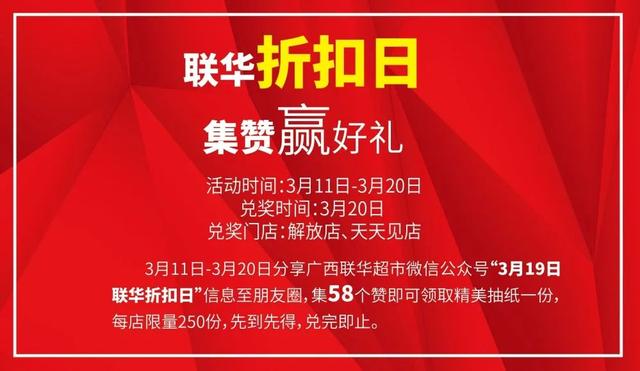 3月11日-20日,分享广西联华超市微信公众号“3月19日联华折扣日”信息并获得58个赞,即可领取精美抽纸一份!