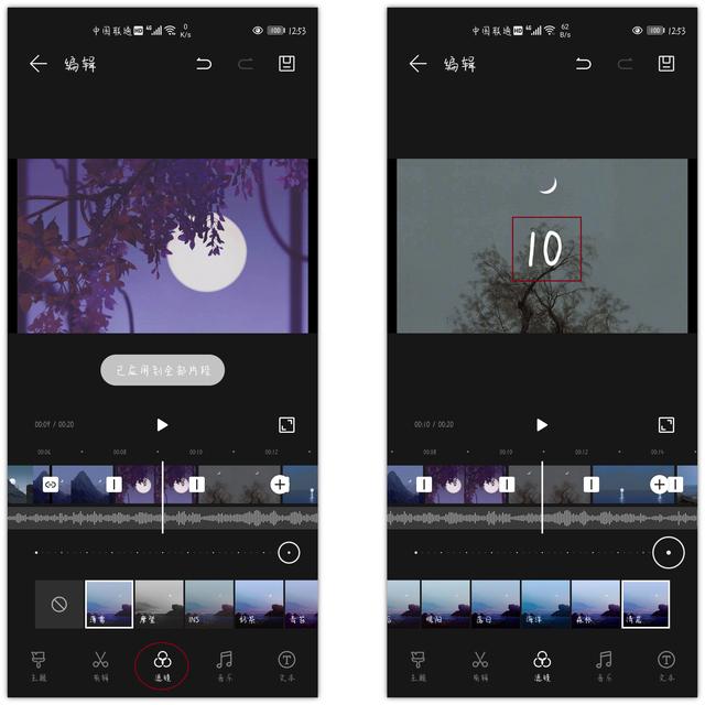 如果你觉得视频太单调了,可以一键套用上面的主题,提供的分格有微风、怀旧、午后、散步、崛起、俏皮,并且自带背景音乐。