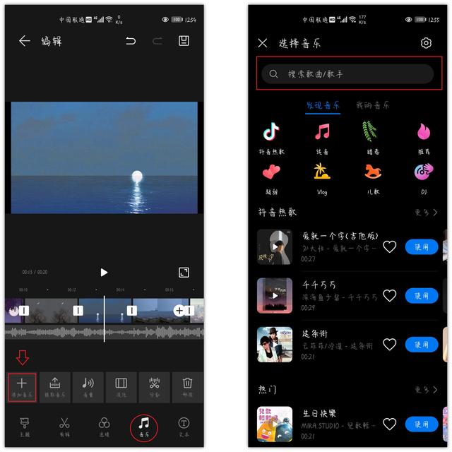 前面我们说到的“主题”自带BGM,当然你也可以自定义添加背景音乐或者配音,歌曲库里面的音乐还是蛮多的,从本地添加也行。