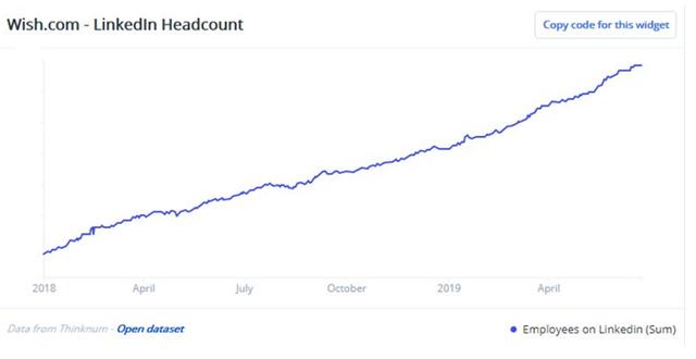 根据 LinkedIn 的数据(如下图)显示,Wish 员工人数一直稳步增长,自2018年至2019年6月底,该公司员工人数增长50%以上。