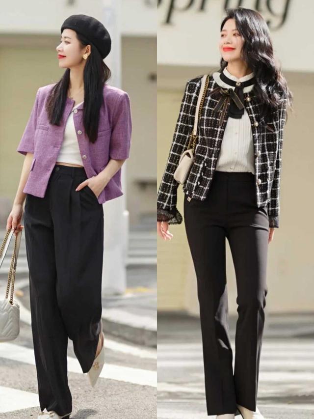 小香风外套也比我们想象中容易搭配,像普通人会用西装裤或者是牛仔裤去搭配小香风外套,这样的穿搭既优雅还休闲,能够让你一秒变高级,而短款小香风外套搭配高腰裤则更适合小个子,能让比例变得出挑。