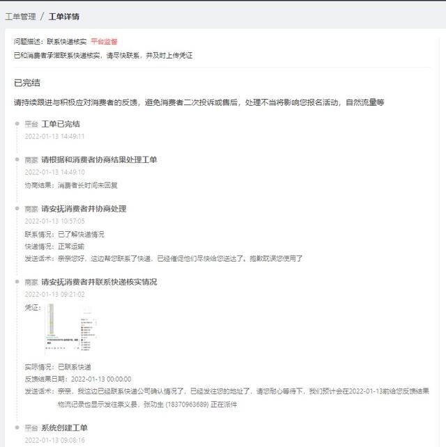 其次,要求我三十分钟后一天内,回复快递的处理结果,我是回复了该件正常,已经催促快递派送。