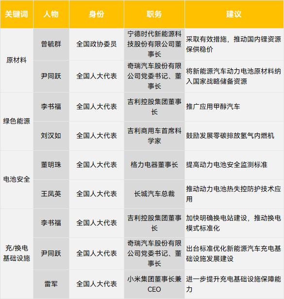 来自吉利的两位全国人大代表分别建议推广甲醇汽车和氢气内燃机,而网易CEO丁磊则称,应研发钠离子电池等新能源电池,提高我国新能源自主权。