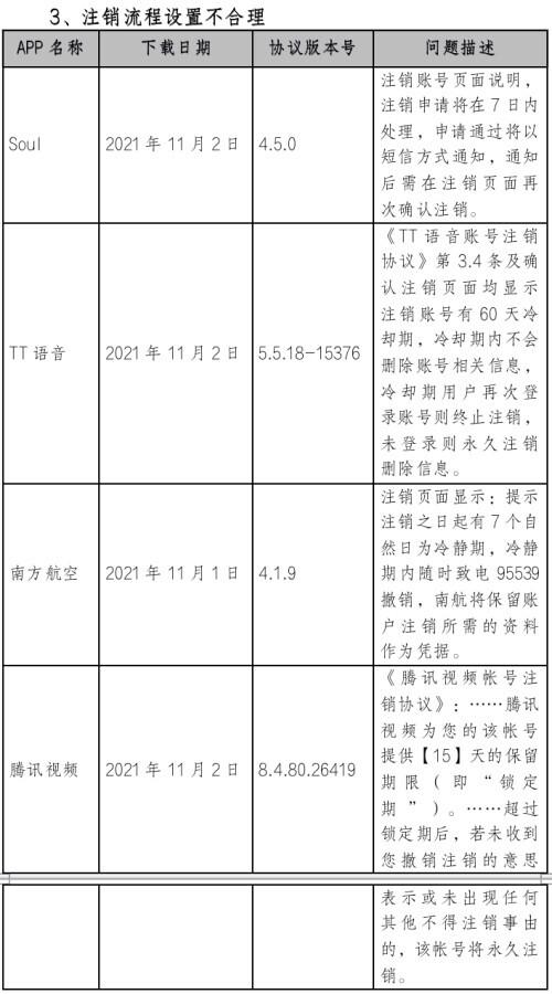 存在的主要问题为:一是未注明注销条件。涉及的App为万顺叫车。二是注销条件设置不合理。涉及的App为嘀嗒出行、百合网、翼支付、淘宝、快乐购、饿了么、麦当劳、枫叶租车和1905电影网。三是注销流程设置不合理。涉及的App为Soul、TT语音、南方航空和腾讯视频。四是经人工审核方可注销,但人工审核存在无人受理、承诺时限过长(超过15个工作日)或者承诺时限不明的情况。涉及的App为爱抢购、禾适外卖、南方航空、萌果和抱抱直播。五是无法通过App直接注销。涉及的App为6人游、携程租车和腾讯视频。
