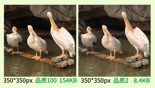 区别就是压缩过的图片清晰度会没有原来那么好,但宽高尺寸不会具改变,这里也给大家示范了一下,下面2张图的宽高尺寸是一样的,唯一不同的是保存的时候我选的品质的数值不一样,为了区别能明显些,左边图片品质填的100,尺寸为154KB;右边品质填的2,尺寸仅为8.4KB。但可以明显感觉到右边图像的画质就没有左边的好,细节损失了不少,噪点也变多了。
