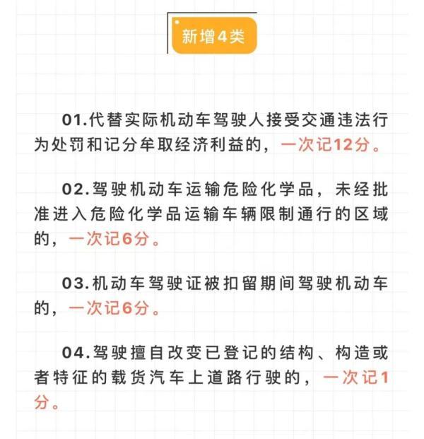 近日,公安部发布了新制定的《道路交通安全违法行为记分管理办法》(公安部第163号令)将于2022年4月1日起正式施行,2022版《办法》在保持对酒后驾驶、交通肇事致人伤亡后逃逸、使用伪造变造牌证等严重妨碍交通安全的违法行为高压态势的前提下,根据对道路交通安全畅通影响的程度,对交通违法记分做了调整,相比“2016版”交通违法与记分,2022版记分的交通违法共50项,其中7项记12分,7项记9分,11项记6分,15项记3分,10项记1分。记分类型增加了扣9分、删除了扣2分的违法行为。