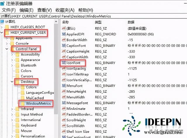 2、依次打开 HKEY_CURRENT_USERControl PanelDesktopWindowMetrics。