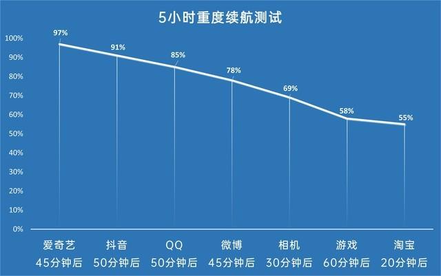 轻薄手机一般都不会被和“长续航”挂钩。但是如果一部仅为7.6毫米的手机有了4500毫安时容量的电池,那么我们就不能用传统眼光看待它。于是我们进行了严格的5小时续航测试,包括45分钟爱奇艺视频(超清分辨率)、50分钟抖音、50分钟QQ聊天、45分钟微博、30分钟视频录制、60分钟《王者荣耀》和20分钟淘宝。