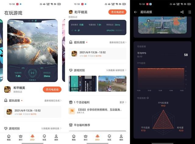 除了X轴线性振动马达,OPPO Reno6 Pro另一个在游戏方面的惊喜是新的“游戏中心”。通过游戏中心里的“游戏+”,我们不仅能设置闪电启动、性能模式、画面滤镜和通知限制等,还能看到个人的游戏战报、游戏帧率统计、游戏近期活动,以及相对应的游戏社区。
