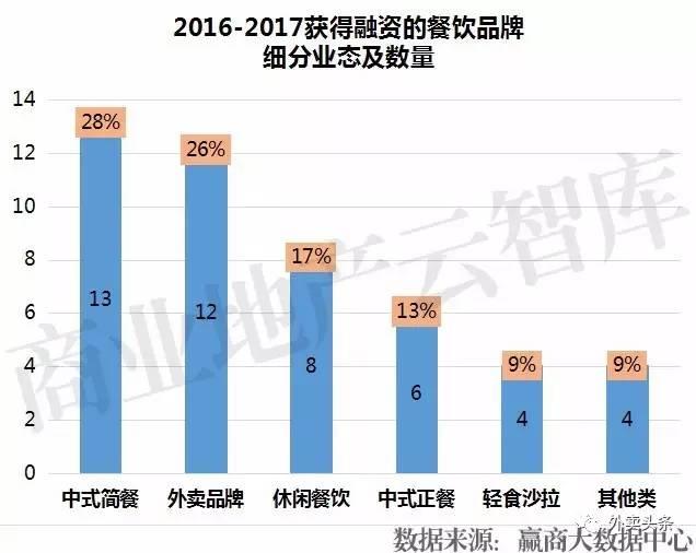 堂食+外卖+到店自提,三驾马车拉动订单,杠杠的!2016-2017年,根据统计的47家获得融资的餐饮品牌中,从细分业态来看:中式简餐、外卖品牌、休闲餐饮三类最受资本市场青睐,分别占比达28%、26%、17%。
