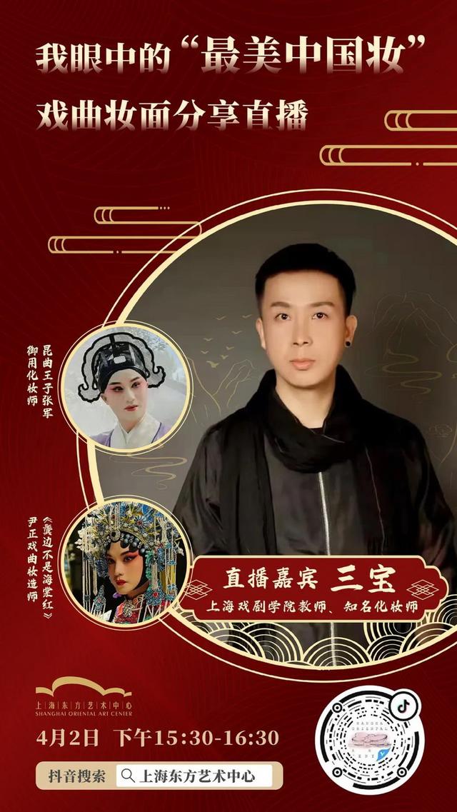 4月2日,东艺将邀请知名戏曲化妆师三宝做客,分享戏曲妆面。他是“昆曲王子”张军的御用化妆师,也曾在热门电视剧《鬓边不是海棠红》中为演员尹正设计京剧妆容,“商细蕊”惊艳的妆容给观众留下了深刻的印象。