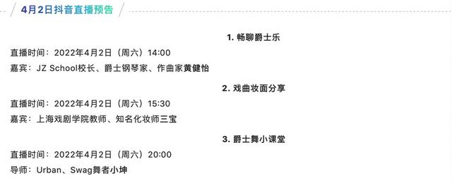 4月2日在抖音,上海东方艺术中心将邀请爵士钢琴家黄健怡、舞者小坤、化妆师三宝做客,在三场直播活动里,和你畅聊爵士乐,教你热跳爵士舞,带你细看“最美中国妆”,让你的艺术DNA动起来。