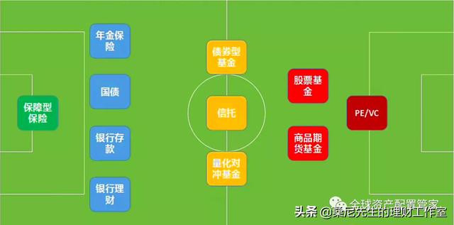 1)底层保障,占比最大,包括银行存款、保险、现金管理类产品等金融工具,保证资产的流动性和基础风险保障;