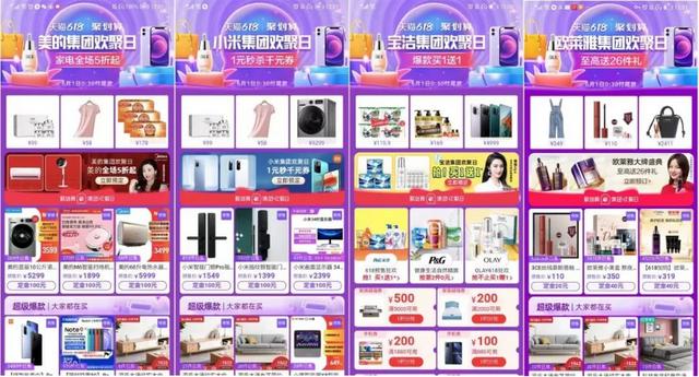 同样通过聚合力量实现爆发的,还有集团欢聚日。今年618,聚划算集团欢聚日联合宝洁、欧莱雅、美的、小米等四大集团展开合作,并整合了天猫预售主会场、聚划算预售主会场、淘宝App以及聚划算频道各端口,保证超亿级的流量曝光。