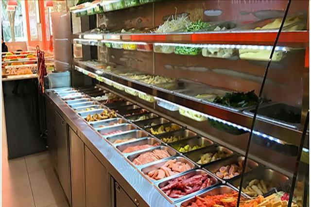 麻辣烫的展示柜上有百十种产品,其中有几十个是荤的,有几十个是素的。素的就是豆制品加青菜。