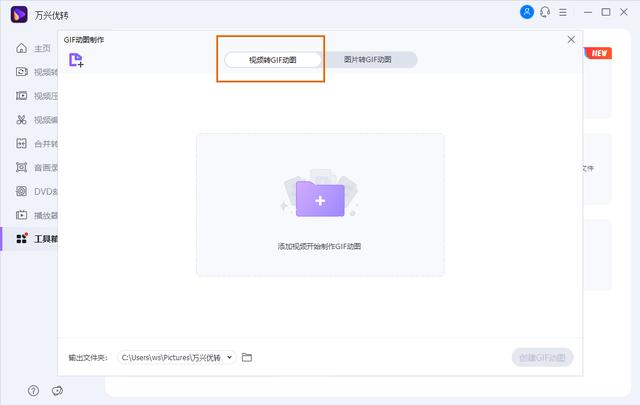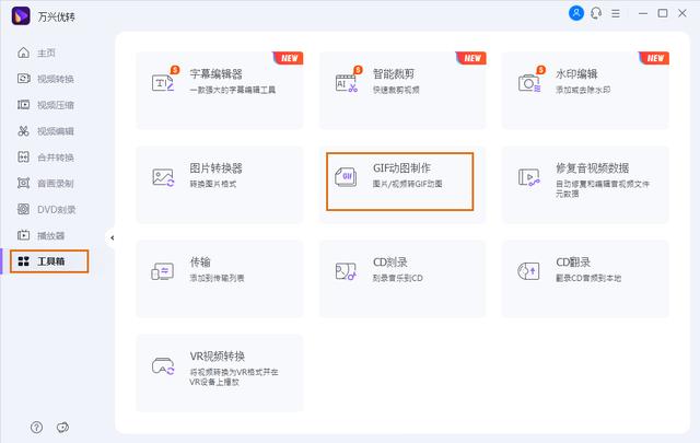 1、启动万兴优转然后选择工具箱板块,单击GIF动图制作功能
