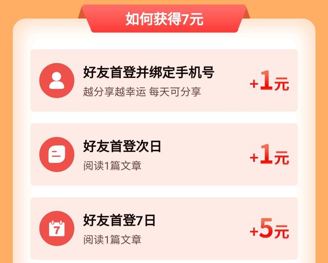 三步完成邀约任务拿到红包,你可能以为活动结束,但实际惊喜福利才刚刚开始。好友注册完好友后,如果完成阅读一篇文章,你可以额外获得1元红包;如果好友连续7天每天登陆凯迪网APP,并阅读完1篇文章,还能再获奖励5元。现在只需每天提醒一下好友,花两分钟吸收最热门新鲜的资讯,就能轻松赚取7元现金红包。