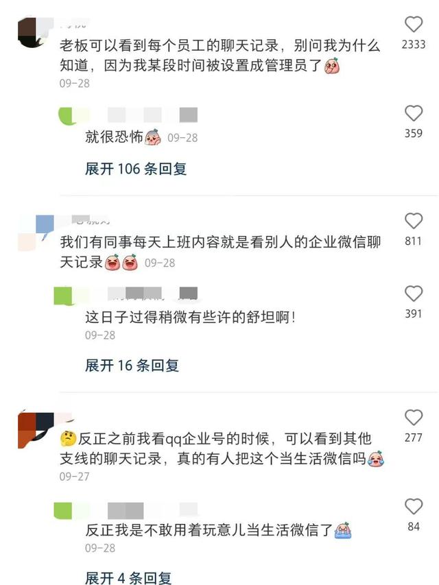 随后便有网友自称是企业微信管理员,直呼真有此事,不过只有管理员是可以看到员工聊天记录的。大部分人不知情,是因为权限关系,只有企业微信管理员可以在后台监看。