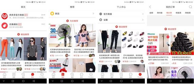 拼多多的主要功能区分为五个区域,即首页、搜索、推荐、聊天、个人中心这五个区域。