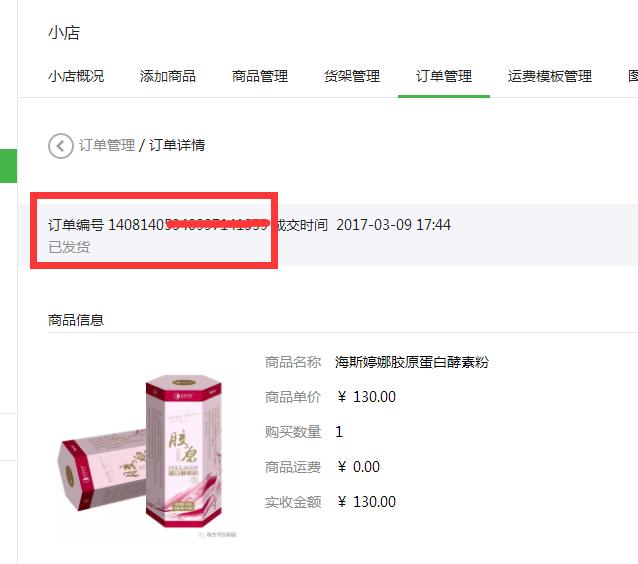 1、打开微信公众号,点击微信小店,找到订单管理,查看订单详情,找到订单编号,复制订单编号