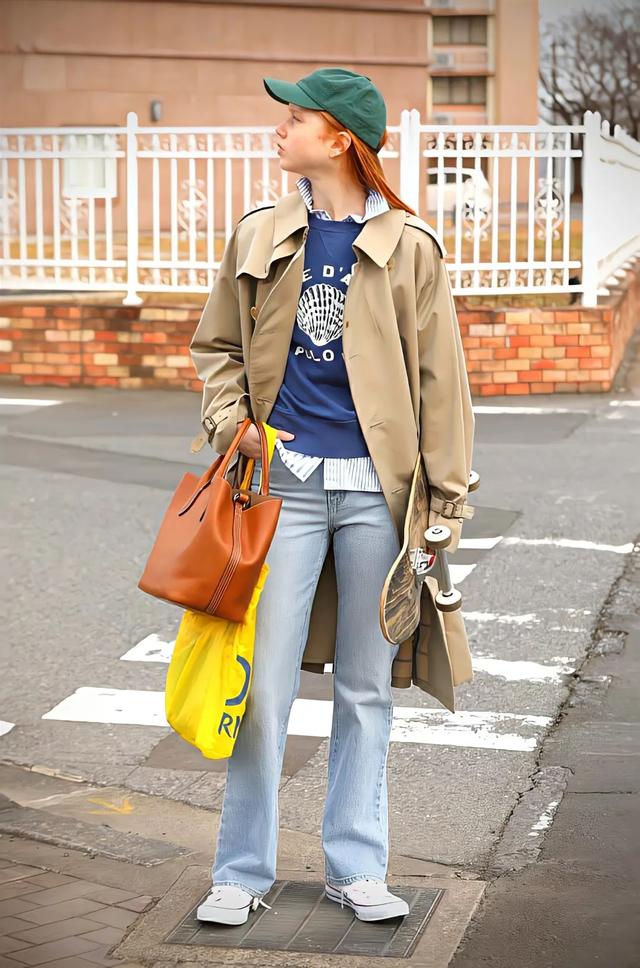 搭配不同的内搭,还能穿出不同的风格。卡其色/棕色风衣搭配字母T恤、衬衫,上身就有随性慵懒的感觉。