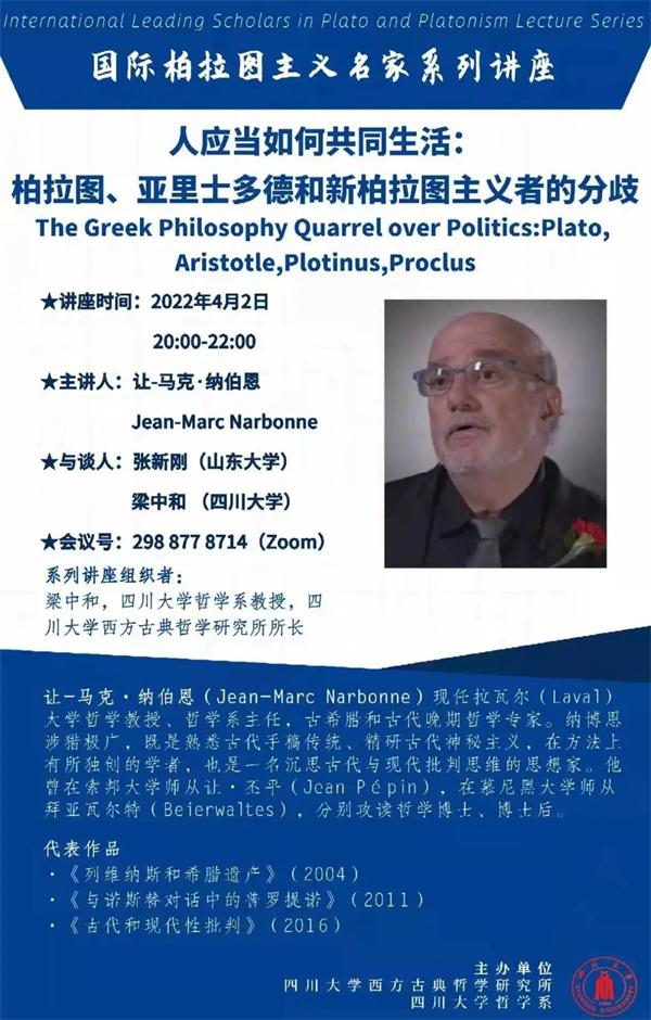 “国际柏拉图主义名家系列讲座”本讲邀请的让-马可·纳伯恩教授,现任拉瓦尔(Laval)大学哲学教授、哲学系主任,古希腊和古代晚期哲学专家。他涉猎极广,既是熟悉古代手稿传统、精研古代神秘主义,在方法上有所独创的学者,也是一名沉思古代与现代批判思维的思想家。