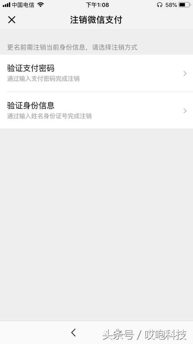 确认注销后,跳转到注销方式界面,我们在更名前需要注销当前身份信息,自行选择注销方式进行注销即可,这样我们的身份证就和微信解绑了。