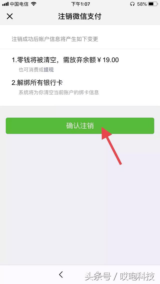 然后会显示“注销微信支付”界面,我们选择确认注销。(注:如果我们的零钱小于 50 元,注销后零钱将全部清空。如果零钱大于 50 元,我们必须提现后才能进行注销操作)