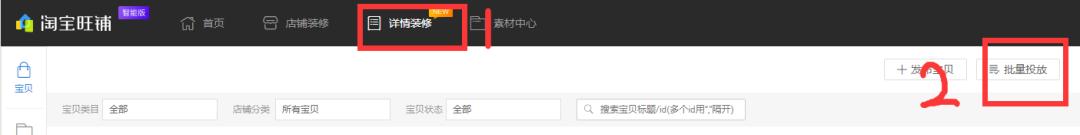 【卖家中心】—【店铺设置】—【店铺装修】—【详情装修】—【批量投放】