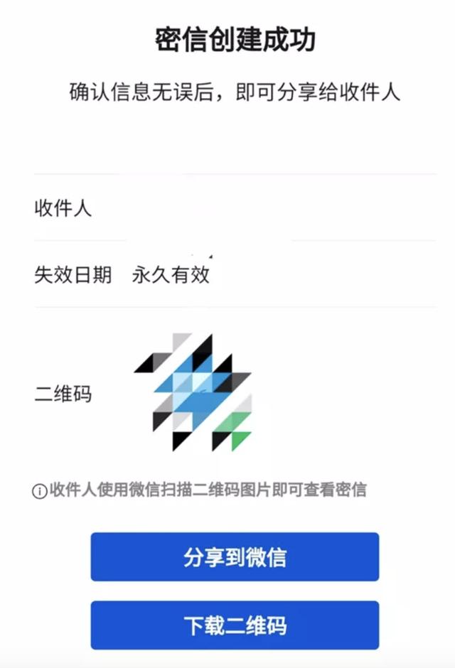不过这里大家需要注意,该密信将会被生成二维码,而并非乱码或信息的方式发给对方。当对方收到该二维码后即可查看密信,这里需要注意的是,收件人想要查看解密也是要使用“腾讯密信”的。