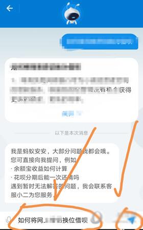在界面下方的箭头指向的搜索框中输入如何将网商贷切换为借呗,然后点按右下方箭头指向的标志。