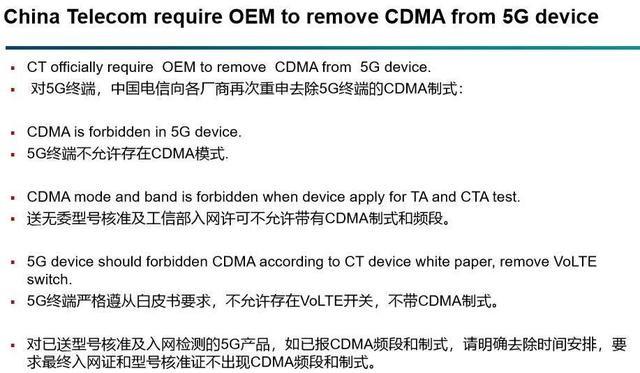 2019: 中国电信要求:自2020年起,所有5G终端不允许CDMA频段和制式,不允许VoLTE切换。