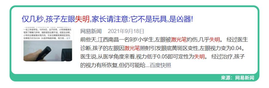 去年,一名9岁男孩玩激光笔,导致眼睛灼伤,几乎失明。