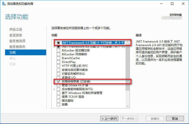 检查。Net Framework 3.5和功能选择界面中的故障转移集群。
