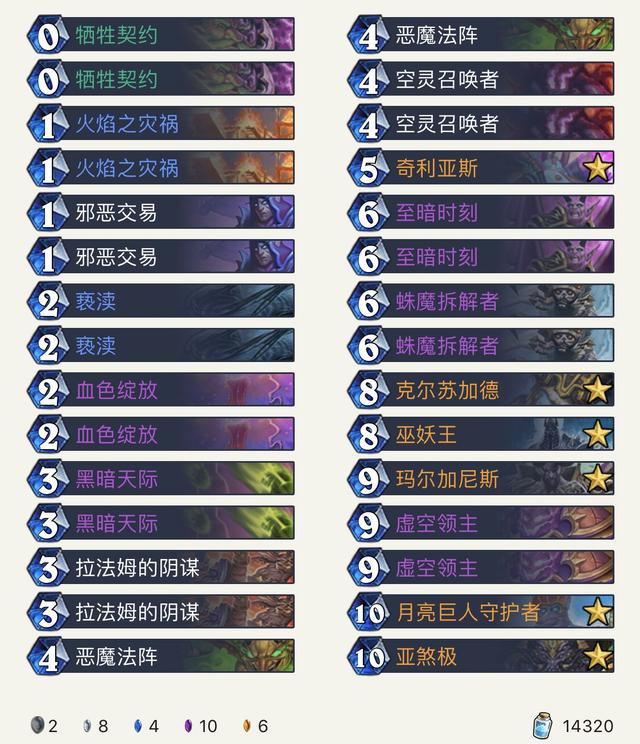 面对法师、牧师这样的职业,尽量找钥匙。你怎么能来?面对术士卡牌组,你可以留下一份牺牲契约在手。【/br/】面对快攻职业,比如萨满、战士,不能只考虑完全入手。你可以把黑暗的天空和亵渎留在手中。也可以考虑在有阴谋和邪恶魔法阵的情况下离开火灾。有亵渎的可以离开邪恶的交易。也可以保持空精神。有了939可以考虑找祭祀契约。把其他东西都洗干净,找到启动钥匙卡。一般情况下,三费和一波暗黑天空或者亵渎可以给我们两三轮的准备时间。从五费开始,只要把钥匙卡收齐,就可以完全无视对面场景和自己血量(前提是你血会开花不会死)直接开始,一波反超压干掉我们;如果我们的空灵按时出来,带出大魔王,那么如果不能启动,我们也可以先召唤小恶魔站在场上,等天黑了再开始下一轮。如果没有,可以配合亵渎,控灾或者直接参与交换。