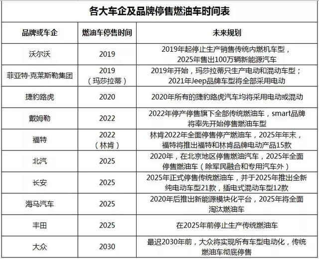 针对这一政策,部分车企也公布了停产销售燃油车的时间表。