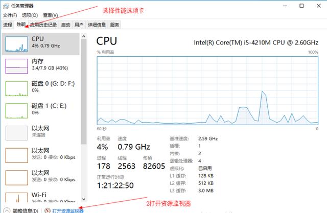 首先,按Ctrl+Shift+Esc打开任务管理器。然后切换到performance选项卡,单击底部的打开资源监视器。
