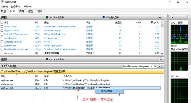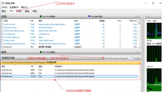 在监视器窗口中,切换到CPU选项卡,并在关联的句柄搜索框中,输入要删除的文件夹路径。过一会儿,系统会列出一些流程。