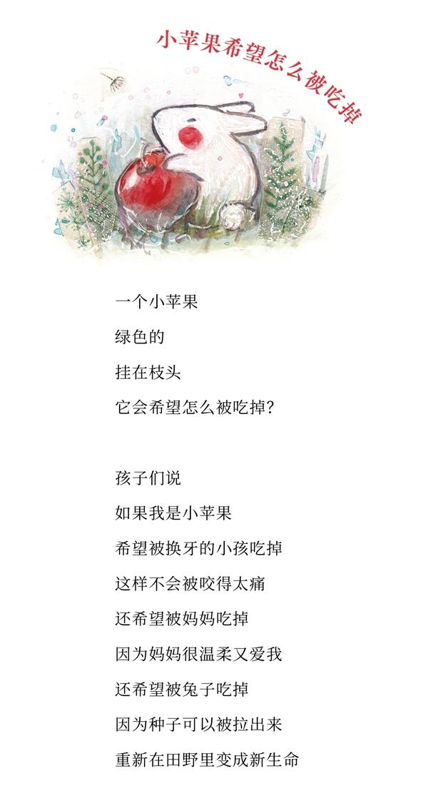 论文:作为幼儿园的园长,孩子们给了你很多儿童诗歌创作的灵感,你也一直在大力推动儿童阅读和诗歌教育。书中有一个类似“小苹果想怎么被吃掉”的互动文案。能否介绍一下诗歌教育和儿童诗歌创作的实践?你觉得亲近诗歌会给他们的成长带来不一样的东西吗?